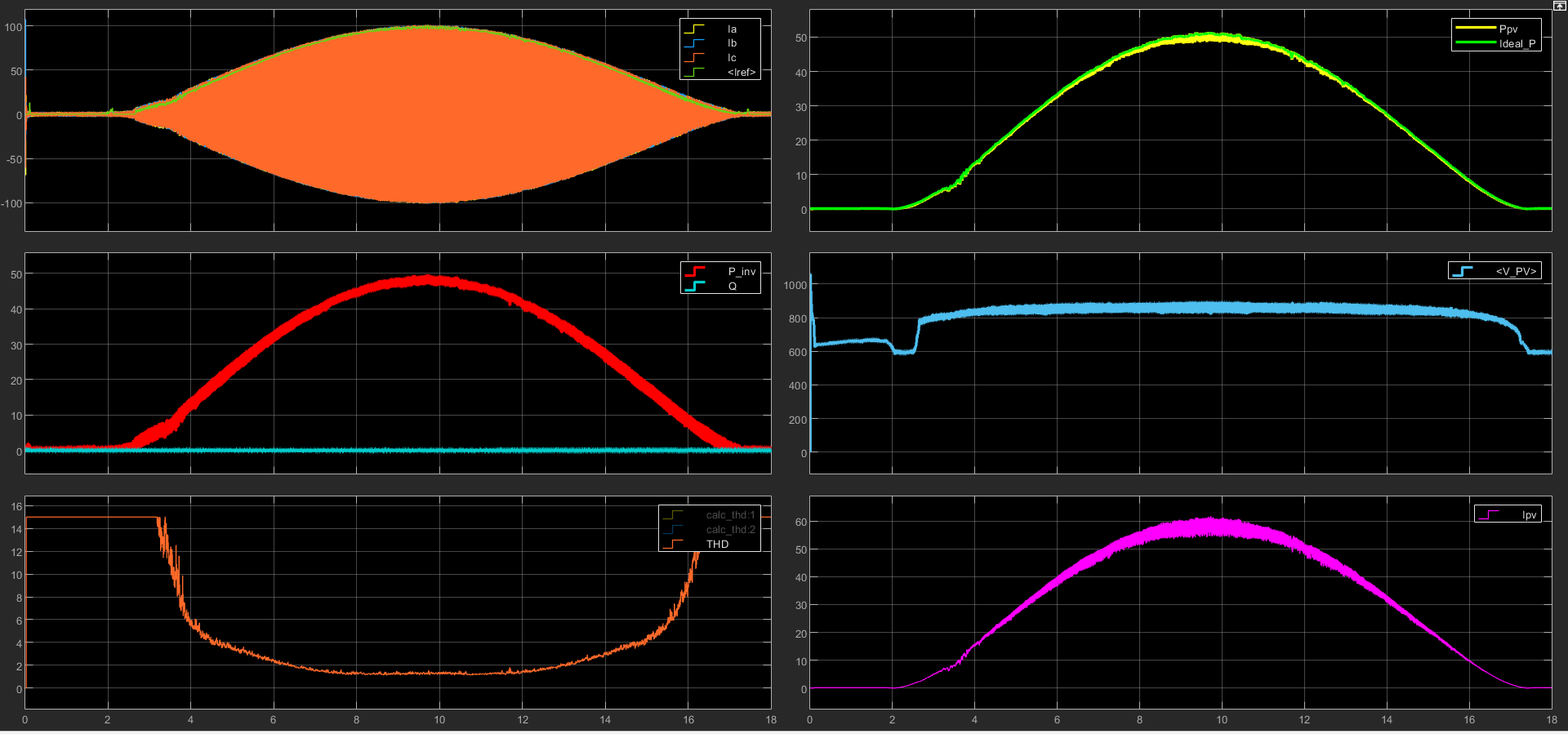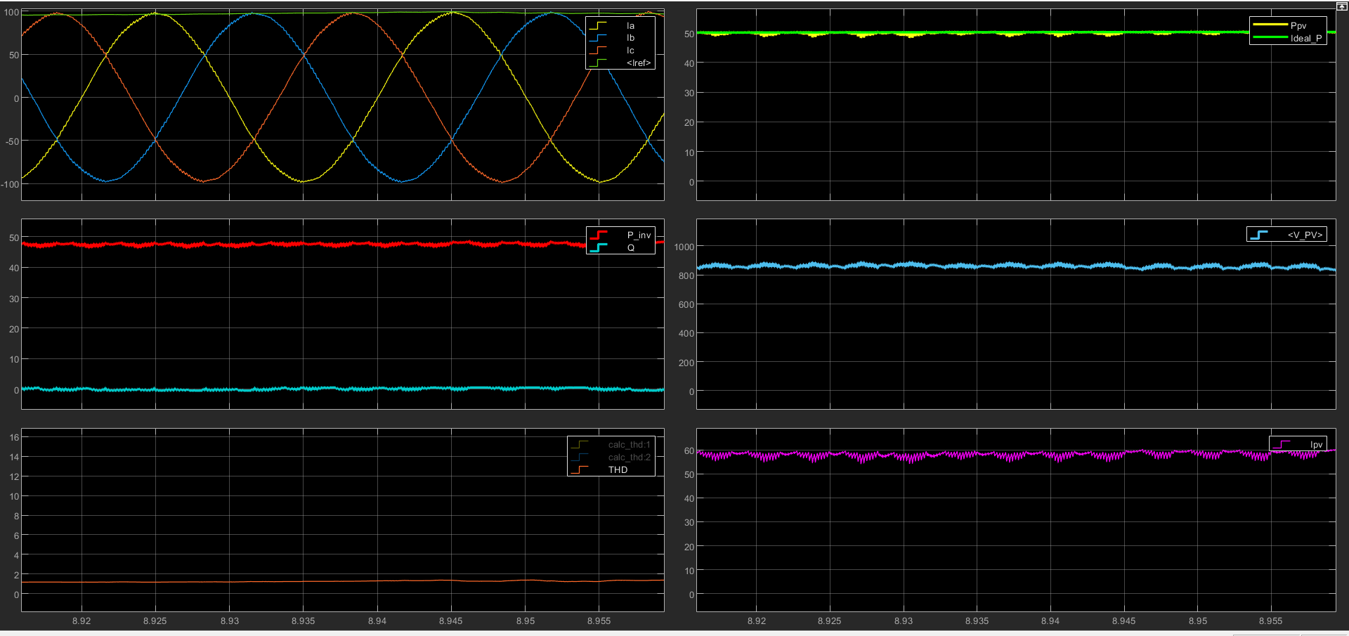 First graph shows Ia Ib Ic and Iref, Iref is generated by MPPT for maximum power tracking. Following the Iref curve, in second graph power output from inverter is 50KwP for irradiance of 4.69; however I have changed irradiances in this scenario to much lower values to see how the system behaves. Also reactive power output is almost zero in the second graph which is our major objective. Third grpah shows Total Harmonic Distortion(THD) is almost below 5% for high power applications which is appreciable. Graph 4 shows power output from PV module, it is tracking maximum power at varied irradiances. Graph 5 depicts almost constant output voltage = 800V from PV array with graph 6 showing maximum current during varied irradiance.