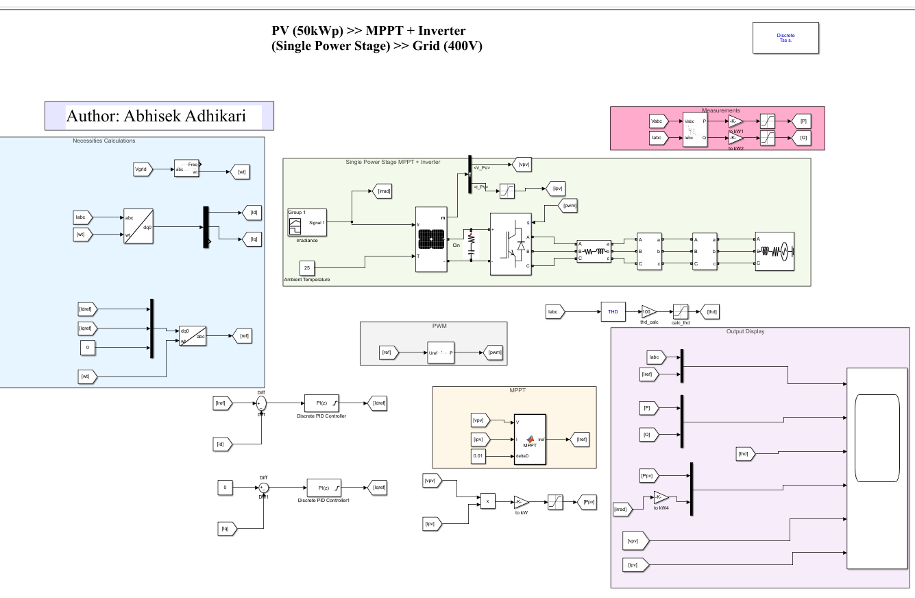-  Grid Connection Principle : We want power to be fed to the grid such that maximum active power from the PV panel via MPPT is put into the grid. For maximum active power transfer between the MPPT and the grid, the current fed by the MPP, Imp must be in phase with the grid voltage (Vgrid). The PV to Grid topology in our case is a single power stage topology where MPPT algorithm is built inside the inverter. The MPPT algorithm produces varying duty cycle that controls the switching of 6 IGBT/diode switches. A very basic layout of the PV>>inverter>>Grid is shown below: