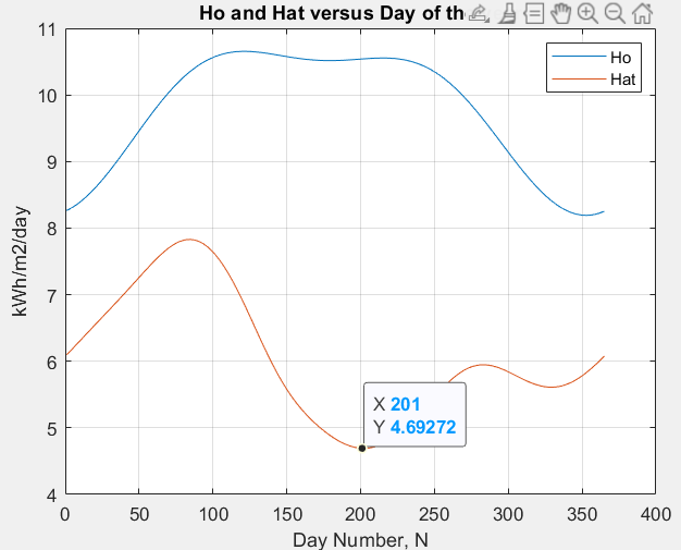 For our Solar Power Plant Project, previously, we had scripted a MATLAB file for incident energy calculation in tilted PV panels with atmospheric effect taken into account. The incident energy calculation provided us with a graph of incident energy on our latitude throughout the year. The MATLAB script can be found here. The result is a Hat estimated graph as shown below: